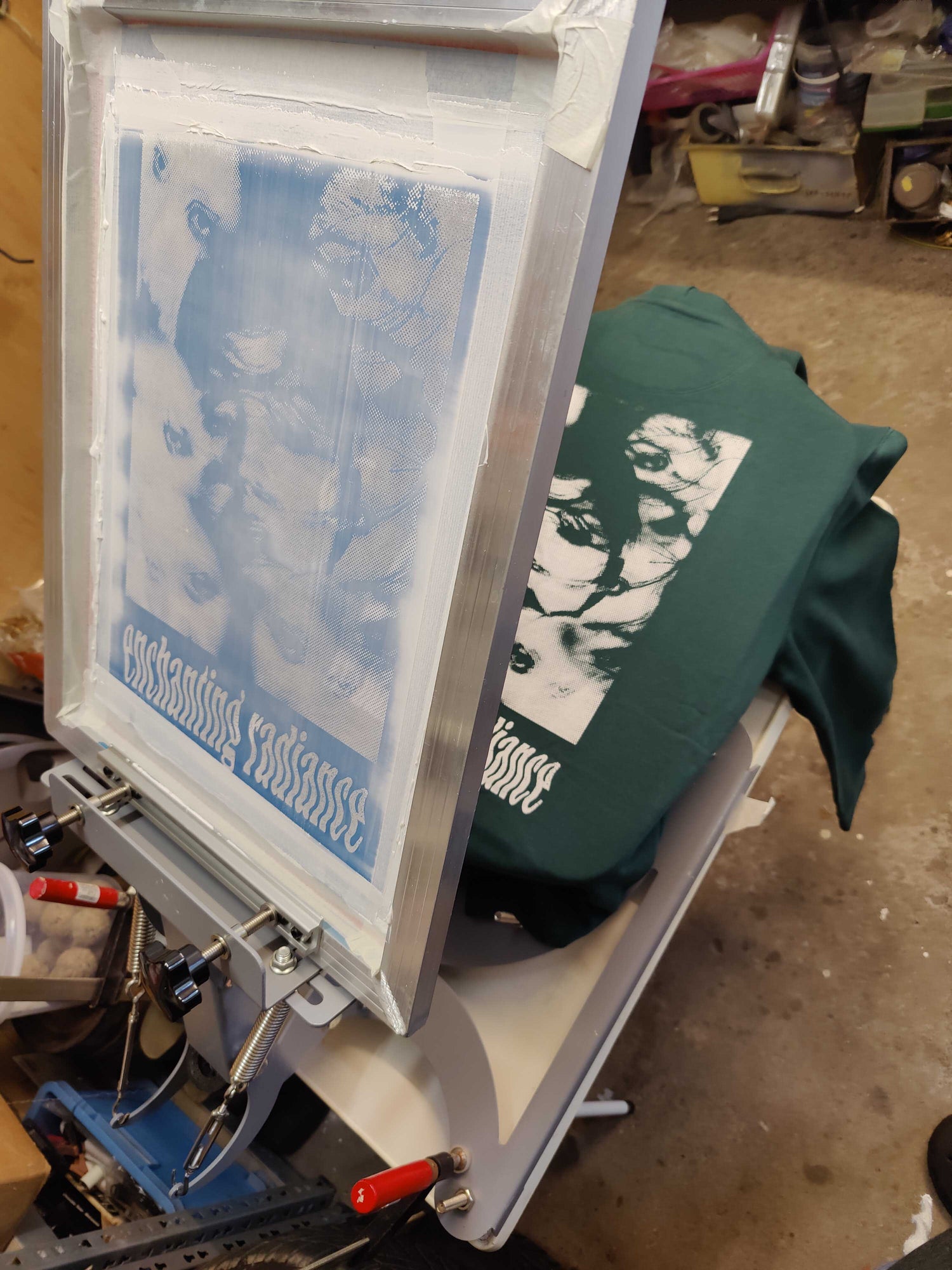Exposing the Screen: A plastic sheet with the design on it, is placed on the coated screen and exposed to a light source. The light hardens the emulsion in the areas that are exposed.